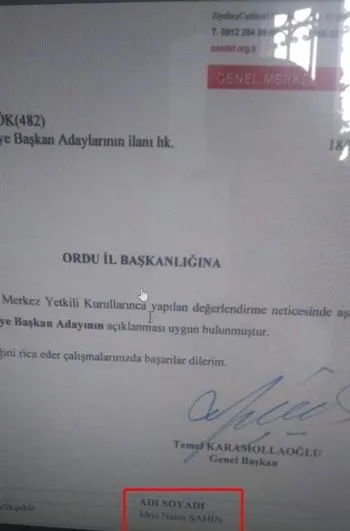 İdris Naim Şahin'in adaylığını onaylayan Saadet Partisi Genel Başkanı Temel Karamollaoğlu'nun imzasının olduğu belge paylaşıldı.