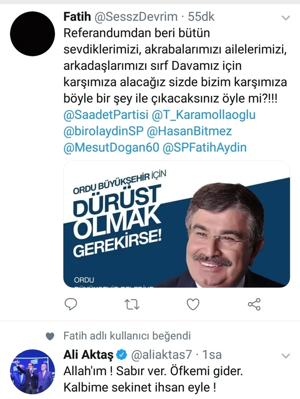 FETÖ'yü destekleyip operasyonu karalayan İdris Naim Şahin, Saadet Partisi'nden Ordu Büyükşehir Belediye Başkan adayı oldu. Bu karara sosyal medyadan sert tepki gösteren parti tabanı Şahin’in adaylığını istemediklerini dile getirdi. İşte o paylaşımlar...
