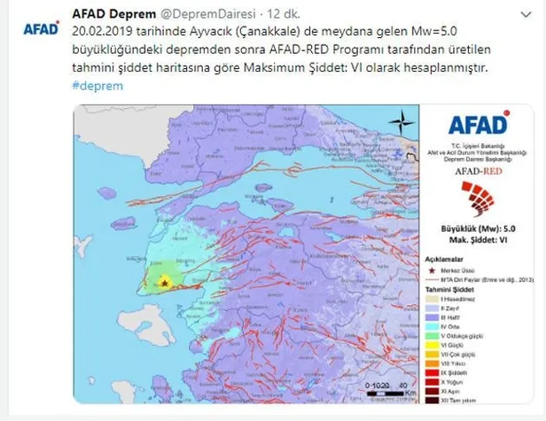 AFAD Deprem Dairesi Başkanlığı, dün gece Çanakkale'nin Ayvacık ilçesinde meydana gelen Richter ölçeğine göre 5.0 büyüklüğündeki depremle ilgili açıklama yaptı. Sosyal medyadan yapılan açıklamada, "20.02.2019 tarihinde Ayvacık (Çanakkale)'de meydana gelen Mw=5.0 büyüklüğündeki depremden sonra AFAD-RED Programı tarafından üretilen tahmini şiddet haritasına göre Maksimum Şiddet: VI olarak hesaplanmıştır" denildi.