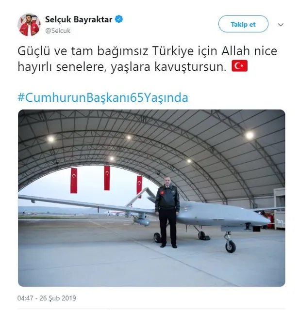 Başkan Recep Tayyip Erdoğan'ın damadı olan BAYKAR Teknik Müdürü Selçuk Bayraktar, resmi Twitter hesabından bir mesaj paylaştı. Başkan Erdoğan'ın doğum günün kutlayan Bayraktar, Türk milletine de mesaj verdi.