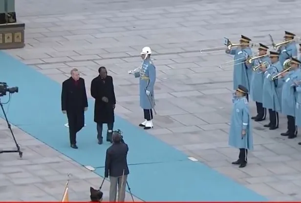 Cumhurbaşkanı Erdoğan, mevkidaşını Cumhurbaşkanlığı Külliyesi'nin ana giriş kapısında karşıladı. İki Cumhurbaşkanının tören alanındaki yerlerini almalarının ardından, 21 pare top atışı eşliğinde iki ülkenin milli marşları çalındı.