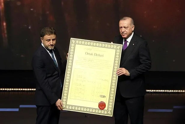 Türkiye Tarım Kredi Kooperatifleri Genel Müdürü Fahrettin Poyraz (solda), programın sonunda, Başkan Erdoğan'a belge takdim etti.