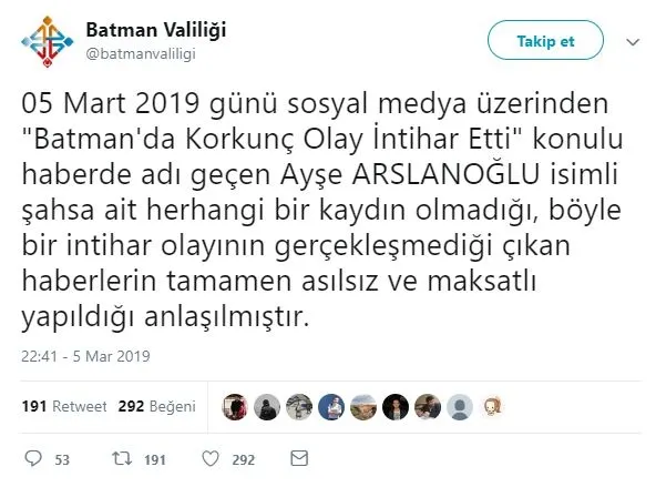 Söz konusu paylaşımlarla ilgili yapılan araştırmada; Haberde adı geçen Ayşe Arslanoğlu isimli bir şahsın Batman ilinde ikamet etmediği, Batman nüfusuna kayıtlı olmadığı ve kayıtlarımızda böyle bir intihar olayının olmadığı tespit edilmiştir.