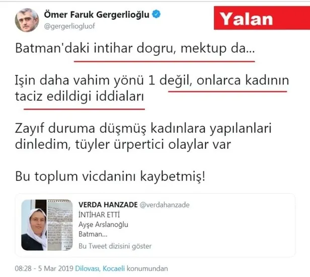 "Batman'da engelli maaşı kesilen ve polis, MİT ve siyasilerin tecavüzüne uğrayan kadın arkasında mektup bırakarak intihar etti." şeklinde tweet atan FETÖ'cü hesapların servis ettiği intihar haberi yalan çıktı. Batman'da Ayşe Arslanoğlu isminde bir kadının yaşamadığı, herhangi bir intiharın olmadığı ortaya çıktı.