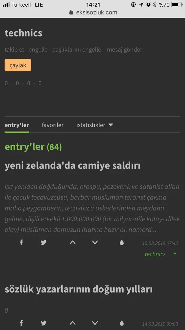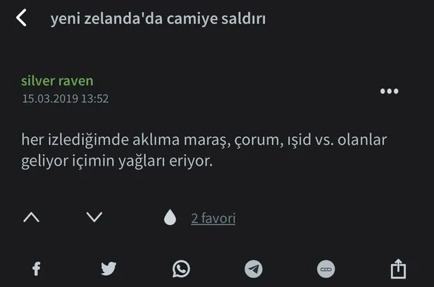 Yeni Zelanda'nın ChristChurch kentindeki iki camiye, cuma namazı esnasında düzenlenen terör saldırı sonucu 49 kişi şehit oldu. Yaşanan kalleş saldırının ardından Ekşi Sözlük'te konu ile ilgili küstahça ve nefret dolu yorumlar yapıldı. Kullanıcılar resmen İslam'a nefret kustu. İşte o skandal paylaşımlardan bazıları...