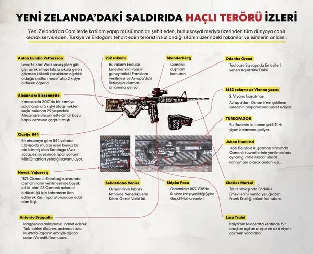Görüntülerde, Christchurch şehrindeki iki camiye düzenlenen terör saldırısının faili Brenton Tarrant'ın, saldırıda kullandığı silahın üzerine tarihte Osmanlılara karşı savaşmış Lazar Hrebeljanovic, Milos Obilic, Baja Pivljanin, Novak Vujosevic gibi Sırp figürlerin adlarını da yazdığı görülüyor.