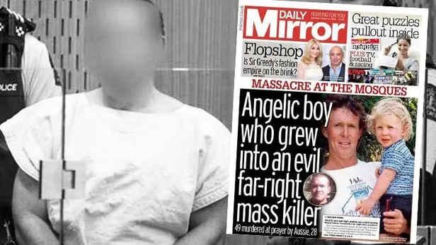 Diğer tepki çeken bir İngiliz basın kuruluşu da Daily Mirror gazetesi oldu. Gazete, "Camilerde katliam" üst başlığını kullandığı haberinde, ilk sayfada teröristin babasının kucağında küçüklük fotoğrafına yer vererek, Brenton Tarrant için "Şeytani bir aşırı sağ katliamcısına dönüşen melek çocuk" ifadesini kullandı.