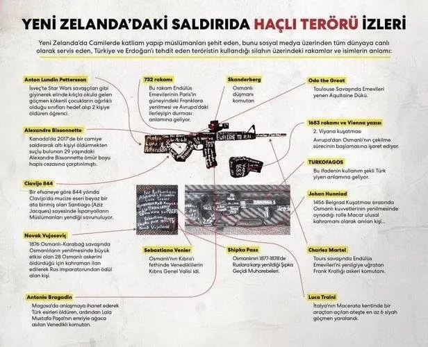 Yeni Zelanda'da camide katliam yapan aşırı ağcı terörist Brenton Tarrant'ın saldırıyı gerçekleştirdiği tüfeğin şifreleri çözüldü. Teröristin silahının üzerine yazdığı birçok ifade İslamofobik, Türk düşmanı ve aşırı sağcı motivasyonu' ortaya koyuyor. Teröristin bu denli tarihi ve siyasi referanslarla Türkiye ve İslam'ı hedef alması sosyal medyada "Bazıları yüzyıllardır hafızasını diri tutarken biz gençlerimize tarihimizi ne kadar yeterli öğretiyoruz?" yorumlarına yol açtı.