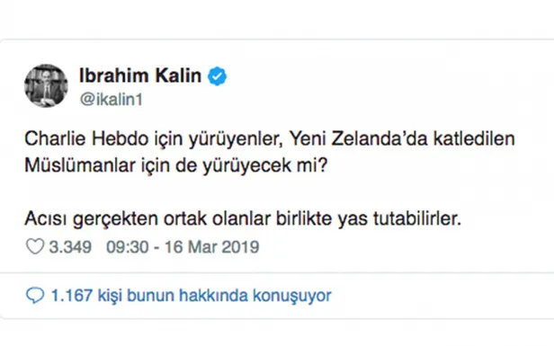 Kalın, Yeni Zelanda'da cuma namazı sırasında gerçekleştirilen silahlı terör saldırısıyla ilgili Twitter hesabından açıklama yaptı. Kalın açıklamasında, "Charlie Hebdo için yürüyenler, Yeni Zelanda'da katledilen Müslümanlar için de yürüyecek mi? Acısı gerçekten ortak olanlar birlikte yas tutabilirler" dedi.