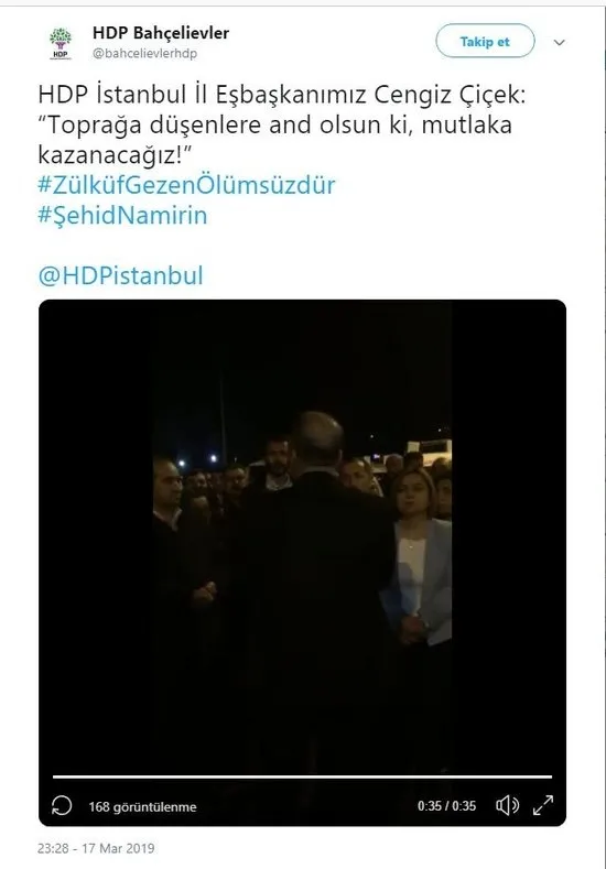 Polis memuru Hüseyin Özdemir'i Şehit eden PKK'lı terörist Zülküf Gezen'in Abdullah Öcalan için cezaevinde kendini asması sonrası HDP İstanbul İl Eşbaşkanı Cengiz Çiçek: "Seçim sürecinde sürece dahil sorumluluklarımızı yerine getirip mutlaka kazanacağız. Toprağa düşenlerimize and olsun" dedi.