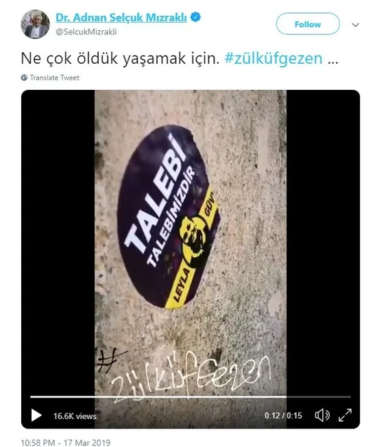 2007 yılında bombalı saldırıda polis memuru Hüseyin Özdemir'i şehit eden, 2'si polis 6 kişiyi yaralayan, Abdullah Öcalan için cezaevinde kendini asan polis katili PKK'lı Zülküf Gezen için HDP'nin Diyarbakır Belediye başkan adayı Selçuk Mızraklı taziye paylaşımı yaptı.
