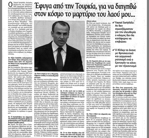 Kıbrıs Rum tarafında yayın yapan, Türkiye karşıtlığı haberleri ile tanınan Alithia gazetesine konuşan Firari HDP'li Faysal Sarıyıldız, AB'den Cumhurbaşkanı Erdoğan'a karşı tutum almalarını istedi, Kıbrıs'ta yaşayan Türkleri ise istilacı ilan etti.