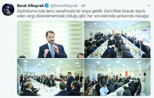 Allbayrak, Twitter'dan yaptığı paylaşımda "Zeytinburnu'nda derici esnafımızla bir araya geldik. Dericilikte ihracatı teşvik eden vergi düzenlememizde olduğu gibi, her sorunlarında yanlarında olacağız." dedi.