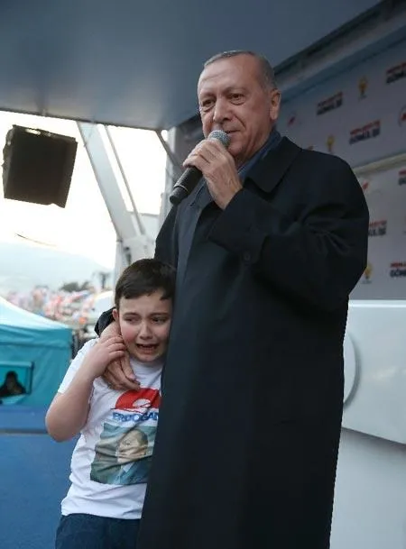 Erdoğan'ın miting sırasında kendisini izlerken ağladığını gördüğü ve yanına çağırdığı 4. sınıf öğrencisi Yılmaz, Cumhurbaşkanı Erdoğan'a sarılmanın mutluluğunu yaşıyor.