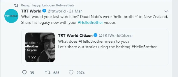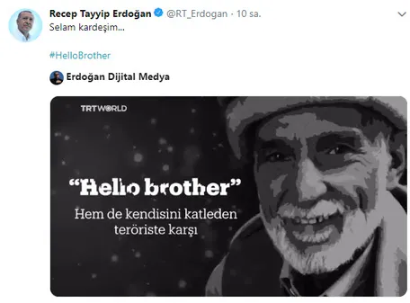 Başkan Erdoğan, Twitter hesabından yaptığı paylaşımla Yeni Zelanda'nın Christchurch kentindeki terör saldırısında hayatını kaybeden Davud Nabi'nin son sözü olan "Hello Brother" yani "Merhaba Kardeşim" kampanyasını destekledi.
