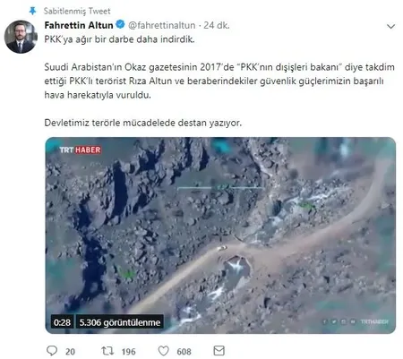 Cumhurbaşkanlığı İletişim Başkanı Fahrettin Altun, Kandil'de PKK'nın lider kadrosuna yapılan operasyonla ilgili, "PKK'ya ağır bir darbe daha indirdik. Suudi Arabistan'ın Okaz gazetesinin 2017'de "PKK'nın dışişleri bakanı" diye takdim ettiği PKK'lı terörist Rıza Altun ve beraberindekiler güvenlik güçlerimizin başarılı hava harekatıyla vuruldu. Devletimiz terörle mücadelede destan yazıyor." dedi..