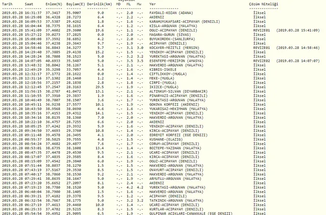 KANDİLLİ RASATHANESİ EN SON DEPREMLER LİSTESİ