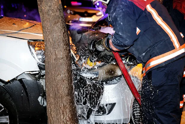 Daha sonra yaralanan sürücü Tetik idaresindeki otomobil, park halindeki 06 EZP 21 plakalı otomobile çarpıp alev aldı.
