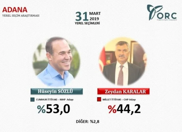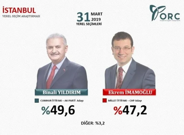 31 Mart 2019 yerel seçimlerine 2 gün kala ORC son anket sonuçlarını kamuoyu ile paylaştı. İstanbul'da Binali Yıldırım 2,4 puan önde görünürken Ankara'da ise Mehmet Özhaseki 0,7 puan önde.