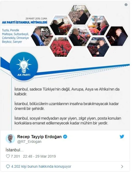 Başkan Erdoğan, Twitter hesabından yaptığı paylaşımda, "İstanbul, bölücülerin uzantılarının insafına bırakılamayacak kadar önemli bir şehirdir. İstanbul, sosyal medyadan ayar yiyen, zılgıt yiyen, posta konulan korkaklara emanet edilemeyecek kadar mühim bir yerdir." dedi.