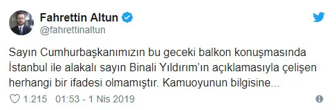 Sayın Cumhurbaşkanımızın bu geceki balkon konuşmasında İstanbul ile alakalı sayın Binali Yıldırım'ın açıklamasıyla çelişen herhangi bir ifadesi olmamıştır. Kamuoyunun bilgisine..