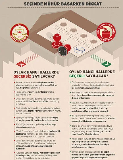 Yüksek Seçim Kurulu (YSK) 31 Mart'ta yapılacak yerel seçimde oyların hangi hallerde geçerli, hangi hallerde geçersiz sayılacağını belirledi. YSK Genelgesi'ne göre, şu şekildeki oy pusulaları geçersiz sayılacak: