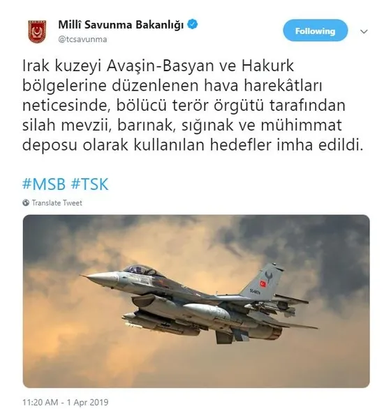 Milli Savunma Bakanlığından yapılan bilgilendirmede, Irak'ın kuzeyi Avaşin-Basyan ve Hakurk bölgelerine düzenlenen hava harekatları neticesinde, bölücü terör örgütü tarafından silah mevzi, barınak, sığınak ve mühimmat deposu olarak kullanılan hedeflerin imha edildiği kaydedildi.