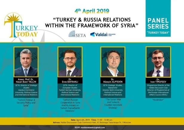 "Suriye Sürecinde Türkiye & Rusya İlişkileri" başlığı altında; 4 Nisan'da Rusya'nın en saygın düşünce kuruluşu olan Valdai Discussion Club ile Türkiye'den SETA temsilcilerinin konuşmacı olacağı panelde, alanında uzman akademisyen yazarlar Suriye gündemine ve Türkiye-Rusya ilişkilerinin stratejik önemine değinecekler. Panele basın mensupları, akademisyenler, iş dünyası, sivil toplum örgütleri ve düşünce kuruluşları davetli olacak.