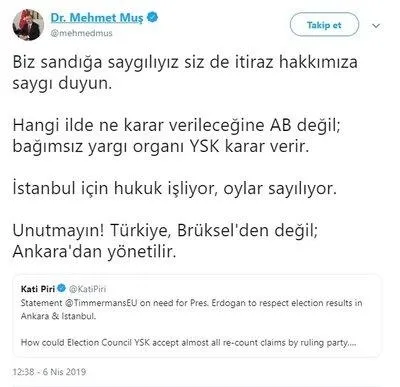 AK Parti Genel Başkan Yardımcısı Mehmet Muş, Kati Piri'nin skandal mesajına tokat gibi yanıt verdi. Muş, Kati Piri'ye yönelik cevabında ''Biz sandığa saygılıyız siz de itiraz hakkımıza saygı duyun. Hangi ilde ne karar verileceğine AB değil; bağımsız yargı organı YSK karar verir. İstanbul için hukuk işliyor, oylar sayılıyor. Unutmayın! Türkiye, Brüksel'den değil; Ankara'dan yönetilir.'' ifadelerine yer verdi.