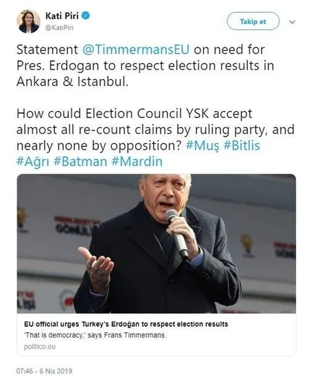 ABD ve Avrupa, yerel seçimler sonrası Türkiye'nin iç işlerine müdahale etmek ve yönlendirmek için çalışmalar yapıyor. 31 Mart yerel seçimlerinde yaşanan usulsüzlükle ilgili yasal süreci hiçe sayarak sanki gayrimeşru bir iş yapılıyormuş gibi bir hava yaratmaya çalışan Batılı ve CHP'li siyasiler YSK'yı hedef tahtasına oturttu. Geçersiz oyların sayılmasıyla birlikte farkın azalmasıyla büyüyen panik açıklamalara da yansıyor. Son olarak Avrupa Parlamentosu Türkiye raportöru Kati Piri sosyal medya hesabı Twitter'dan seçimlerle ilgili paylaşımda bulundu. AB Komisyonu Başkan Yardımcısı Timmerson'u etiketleyerek paylaşımda bulunan Piri, Başkan Erdoğan'ı şikayet etti. Başkan Erdoğan'ın İstanbul ve Ankara'daki sonuçları kabullenmesi gerektiğini söyleyen Piri, YSK'nın da iktidar partisinin taleplerini kabul ettiğini, muhalefetin taleplerini ise kabul etmediğini iddia etti.