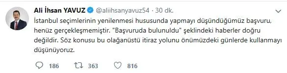 Yavuz, "İstanbul seçimlerinin yenilenmesi hususunda yapmayı düşündüğümüz başvuru, henüz gerçekleşmemiştir. "Başvuruda bulunuldu" şeklindeki haberler doğru değildir. Söz konusu bu olağanüstü itiraz yolunu önümüzdeki günlerde kullanmayı düşünüyoruz." dedi.