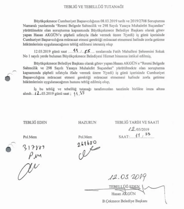 "Resmi belgede sahtecilik ve 298 Sayılı Yasaya Muhalefet Suçu'ndan yürütülmekte olan soruşturma kapsamında Büyükçekmece Belediye Başkanı olarak görev yapan Hasan Akgün'e şüpheli sıfatıyla ifade vermek üzere 7(yedi) iş günü içerisinde Cumhuriyet Başsavcılığı'na müracaat etmesi gerektiği, müracaat etmemesi halinde zorla getirme hükümlerinin uygulanacağının tebliğ edilmesi istenmiştir."