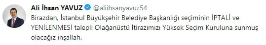 Yavuz, sosyal paylaşım sitesi Twitter hesabından yaptığı paylaşımda da "Birazdan, İstanbul Büyükşehir Belediye Başkanlığı seçiminin iptali ve yenilenmesi talepli olağanüstü itirazımızı Yüksek Seçim Kuruluna sunmuş olacağız inşallah." ifadelerini kullandı.