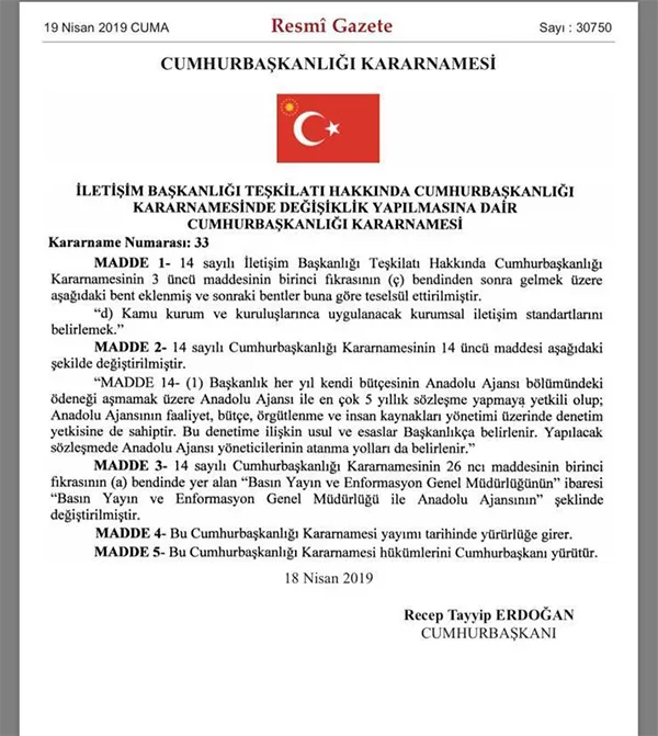 Cumhurbaşkanı Recep Tayyip Erdoğan'ın imzasıyla bugün Resmi Gazete'de yayımlanan kararla 14 sayılı İletişim Başkanlığı Teşkilatı Hakkında Cumhurbaşkanlığı Kararnamesinde değişiklik yapıldı.