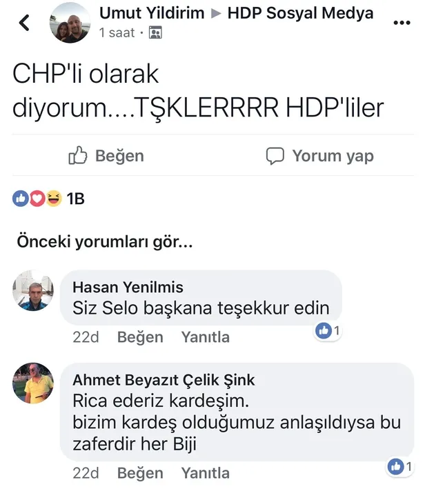 Ele geçirilen mesajlarda, CHP'nin İstanbul adayı Ekrem İmamoğlu'nun mazbatayı alması ile büyük bir sevinç yaşayan HDP'li Ziya Gündüz isimli kullanıcı "İstanbul düştü, Kobani düşmedi. Etme bulma dünyası" ifadelerini paylaşıyor. CHP'ye oy veren Umut Yıldırım'ın "Teşekkürler HDP'liler" iletisine yanıt veren Cengiz Toraman isimli HDP'li ise "Çevremizde CHP'ye yüzlerce oy verdik. İmamoğlu'na helal hoş olsun" sözlerini sarfediyor. Bılele Çobanpınar isimli HDP'li "Hayatımda ilk defa HDP dışında bir partiye Selo başkan hatrına oy verdim" derken, Şexane Piran adlı bir başka HDP'li "AKP-MHP faşizmine inat (terörist)Hacı Lokman Birlik için oy verdik. Sur, Cizre, Silopi, Nusaybin, Hakkari için söz verdik" ifadelerini kullanıyor.