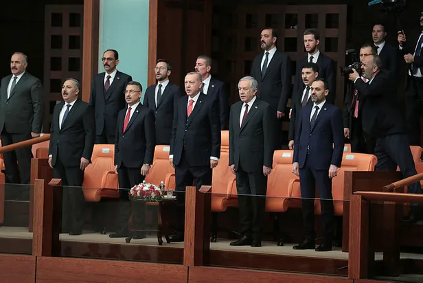 Cumhurbaşkanı Erdoğan'ı en yaşlı TBMM Başkanvekili olarak MHP'li Celal Adan resmi törenle karşıladı. Erdoğan tören kıtasını selamlamasının ardından Genel Kurul salonundaki özel locasına geçti.