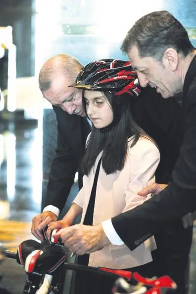 Erdoğan, çocuklara kaskları ile beraber birer bisiklet hediye etti. Görme engelli öğrenci Medine Mevlütoğlu ile yakından ilgilendi.