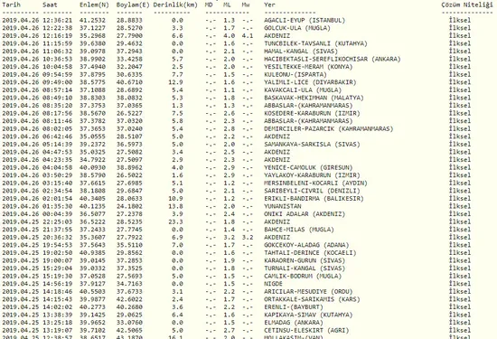 KANDİLLİ RASATHANESİ EN SON DEPREMLER