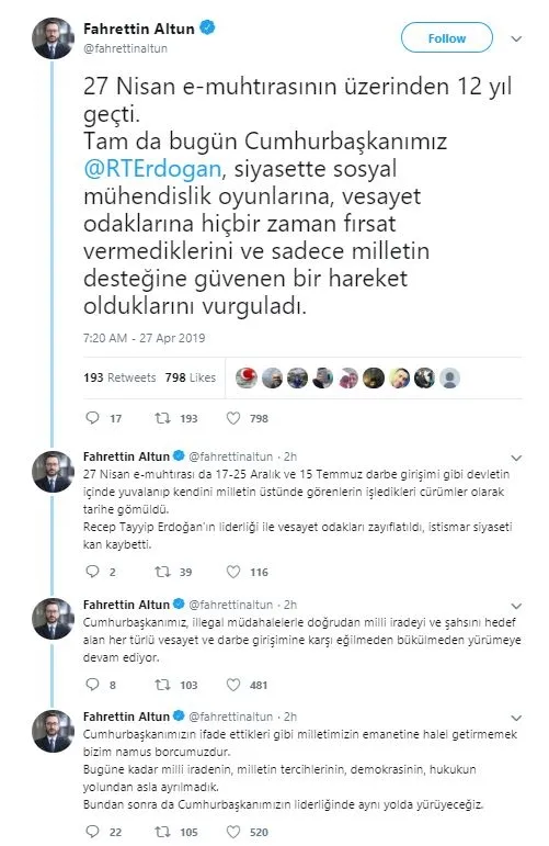 Cumhurbaşkanlığı İletişim Başkanı Altun, ''27 Nisan e-muhtırasının üzerinden 12 yıl geçti. Tam da bugün Cumhurbaşkanımız Recep Tayyip Erdoğan, siyasette sosyal mühendislik oyunlarına, vesayet odaklarına hiçbir zaman fırsat vermediklerini ve sadece milletin desteğine güvenen bir hareket olduklarını vurguladı.'' dedi.
