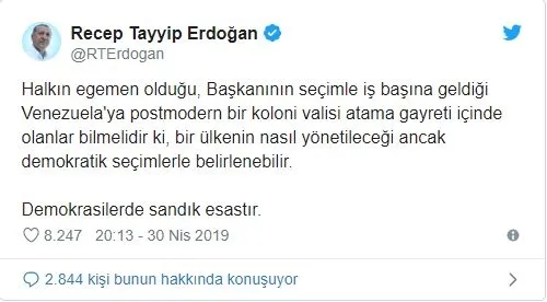 Başkan Erdoğan, "Halkın egemen olduğu, Başkanının seçimle iş başına geldiği Venezuela'ya postmodern bir koloni valisi atama gayreti içinde olanlar bilmelidir ki, bir ülkenin nasıl yönetileceği ancak demokratik seçimlerle belirlenebilir. Demokrasilerde sandık esastır." ifadelerini kullandı.
