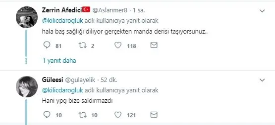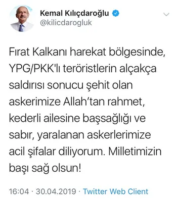Birkaç ay önce katıldığı bir televizyon programında "Türkiye'nin beka sorunu yok, YPG bize saldırmaz" diyen CHP Genel Başkanı Kemal Kılıçdaroğlu'nun Fırat Kalkanı harekat bölgesinde YPG/PKK'lı teröristlerin saldırısı sonucu şehit düşen asker için Twitter'dan paylaştığı "YPG bize saldırdı, askerimiz şehit oldu" mesajına sosyal medyadan tepki yağıyor. Kullanıcılardan biri, "'Yüz' Kemal Kılıçdaroğlu için sadece bir sayı." diye yazdı.