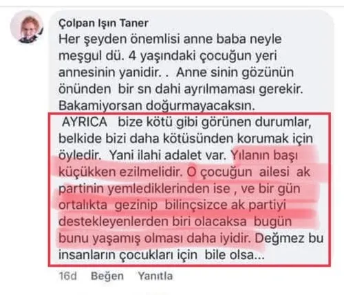 Alınan bilgiye göre, İl Emniyet Müdürlüğü Güvenlik Şube Müdürlüğü ekipleri, 22 Nisan'da Kanarya Mahallesi'nde 5 yaşındaki kız çocuğunun cinsel istismara uğraması sonrası sosyal medya hesabından, "4 yaşındaki çocuğun yeri annesinin yanıdır. Bakamıyorsan doğurmayacaksın. Ayrıca bize kötü gibi görünen durumlar belki de bizi daha kötüsünden korumak için öyledir. Yani ilahi adalet var. Yılanın başı küçükken ezilmelidir. O çocuğun ailesi AK Parti'nin yemlediklerinden ise ve bir gün ortalıkta gezinip bilinçsizce AK Parti'yi destekleyenlerden biri olacaksa bugün bunu yaşamış olması daha iyidir. Değmez bu insanların çocukları için bile olsa..." paylaşımını yapan kadının İzmir'de yaşadığını tespit etti.
