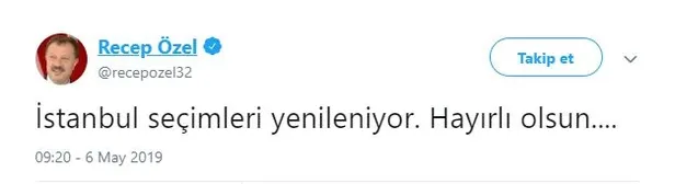 Son dakika haberine göre Yüksek Seçim Kurulu AK Parti Temsilcisi Recep Özel, Twitter paylaşımında "İstanbul seçimleri yenileniyor. Hayırlı olsun" ifadelerine yer verdi.