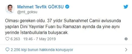Göksu "Olması gereken oldu. 37 yıldır Sultanahmet Camii avlusunda yapılan Dini Yayınlar Fuarı bu Ramazan ayında da yine aynı yerinde İstanbullularla buluşacak." İfadelerine yer verdi.