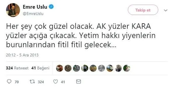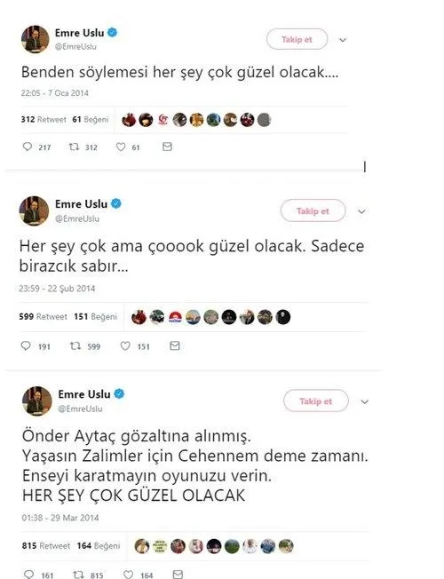 Yine Emrullah Uslu'nun 7 Ocak 2014 günü "Benden söylemesi her şey çok güzel olacak", 22 Şubat 2014 günü "Her şey çok ama çoook güzel olacak. Sadece birazcık sabır", 29 Mart 2014 günü "Önder Aytaç gözaltına alınmış. Yaşasın zalimler için cehennem deme zamanı. Enseyi karatmayın oyunuzu verin. Her şey çok güzel olacak", 16 Ocak 2014 günü "Her şey çok güzel olacak bekleyin gözlerinizle göreceksiniz. Kış güneşine tomurcuk verenler donacak…" ve 18 Ekim 2014 günü "O her şeyi en güzel şekilde yarattı' Her şey çok güzel olacak…" şeklinde tweetler attığı tespit edildi.