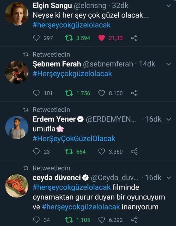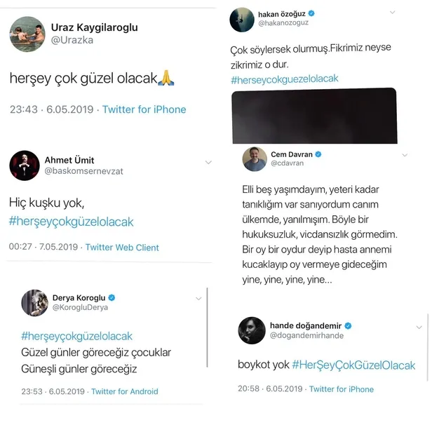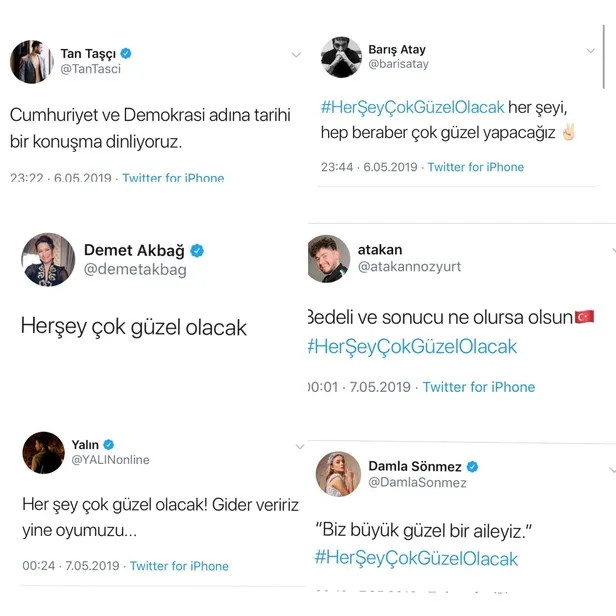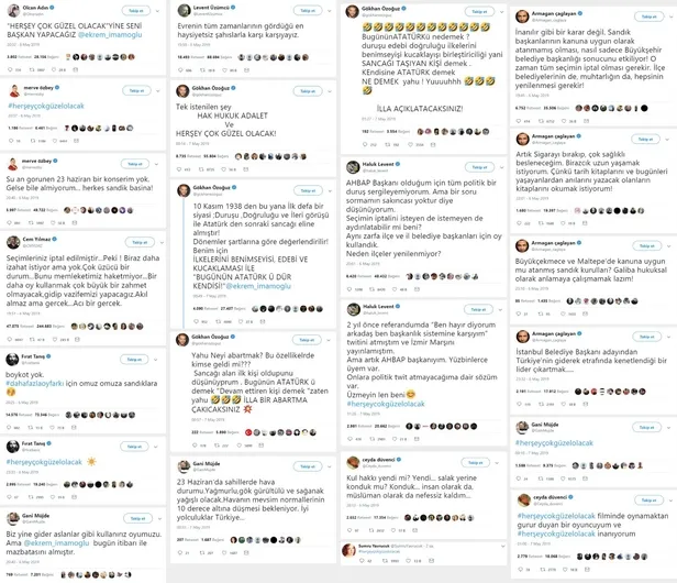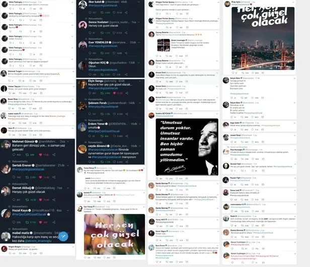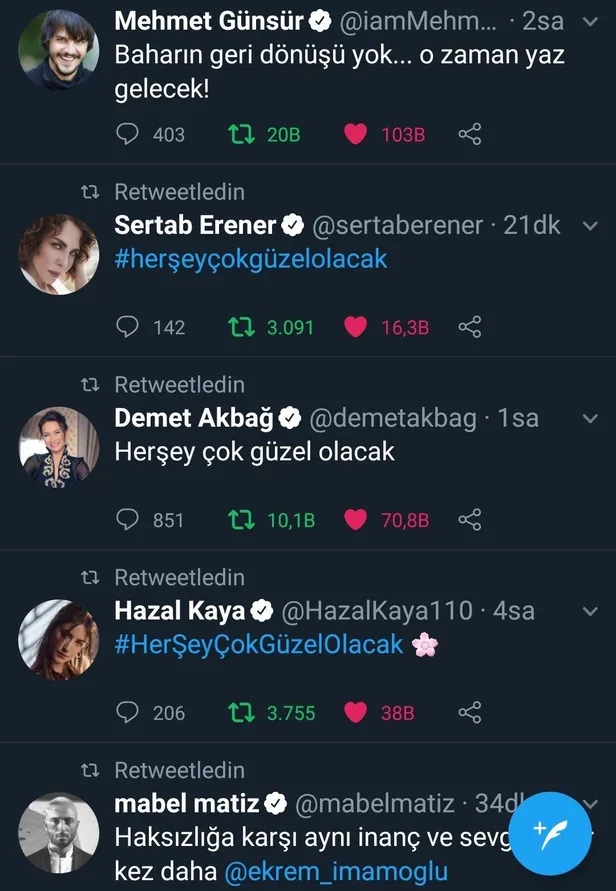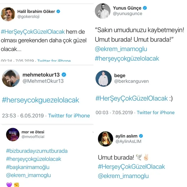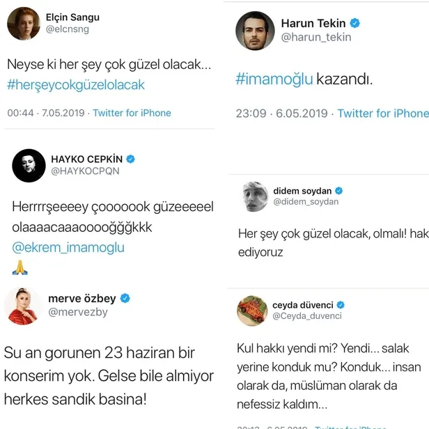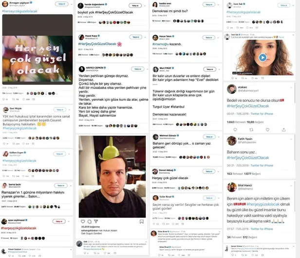 ''Her şey güzel olacak'' Tweet'i atan ünlüler kimler? CHP'li Ekrem İmamoğlu, YSK'nın İstanbul seçim kararından sonra yaptığı konuşmada "Artık herkes konuşacak, sanatçılar konuşacak" diyerek provokasyon çağrısında bulunmuştu. İmamoğlu'nun sözlerinin ardından "#HerseyGuzelOlacak" hastag'i ile birçok sanatçı destek mesajı atmasındaki gerçek ortaya çıktı. Sanatçılara tweet attıran kişinin Gezi Darbe Girişimi sürecinde sanatçıları organize eden ve sokağa çıkaran ID iletişim'in sahibi Ayşe Barım olduğu ortaya çıktı.
