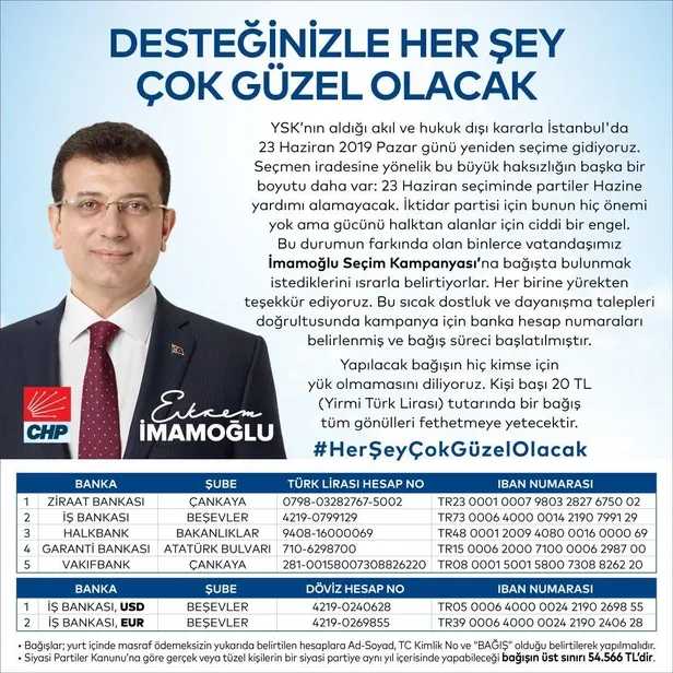 Sandıktaki onca usulsüzlüklerin ortaya çıkmasının ardından Ekrem İmamoğlu'nun mazbatası elinden alındı. YSK'nın İstanbul seçimlerinin yenilenmesine hükmetmesiyle birlikte CHP de İstanbul'da yeni seçim döneminde Ekrem İmamoğlu için kullanılmak üzere bağış kampanyası başlattı.