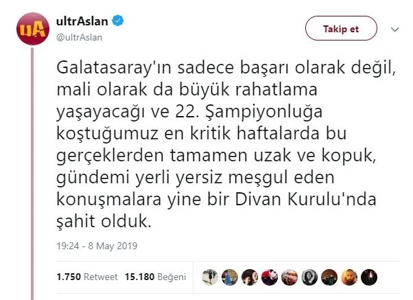 ultrAslan 2.48 milyonluk takipçisinin yer aldığı Twitter'da Hayri Kozak'ı "Galatasaray'ın sadece başarı olarak değil, mali olarak da büyük rahatlama yaşayacağı ve 22. Şampiyonluğa koştuğumuz en kritik haftalarda bu gerçeklerden tamamen uzak ve kopuk, gündemi yerli yersiz meşgul eden konuşmalara yine bir Divan Kurulu'nda şahit olduk" sözleriyle eleştirdi.