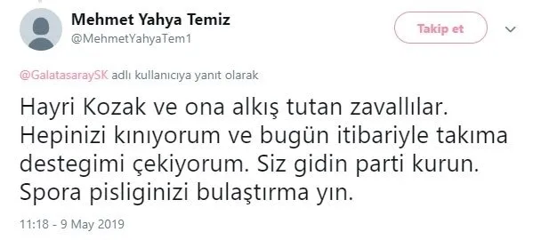 Yine bir kullanıcı da "Hayri Kozak ve ona alkış tutan zavallılar. Hepinizi kınıyorum ve bugün itibariyle takıma desteğimi çekiyorum. Siz gidin parti kurun. Spora pisliğinizi bulaştırmayın" sözleriyle Kozak'ı eleştirdi.