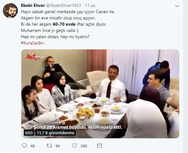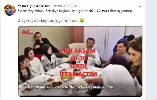 Muhafazakar kesime şirin gözükmek için her yolu deneyen CHP-HDP ve İP'in adayı Ekrem İmamoğlu, her akşam 60-70 evde iftar açtığını söyleyerek baltayı taşa vurdu ve vatandaşların "Böyle şey nasıl olur" diyerek tepkisini çekti. Bu durum akıllara her gün cuma namazı kıldığını söyleyen Muharrem İnce'yi getirdi.
